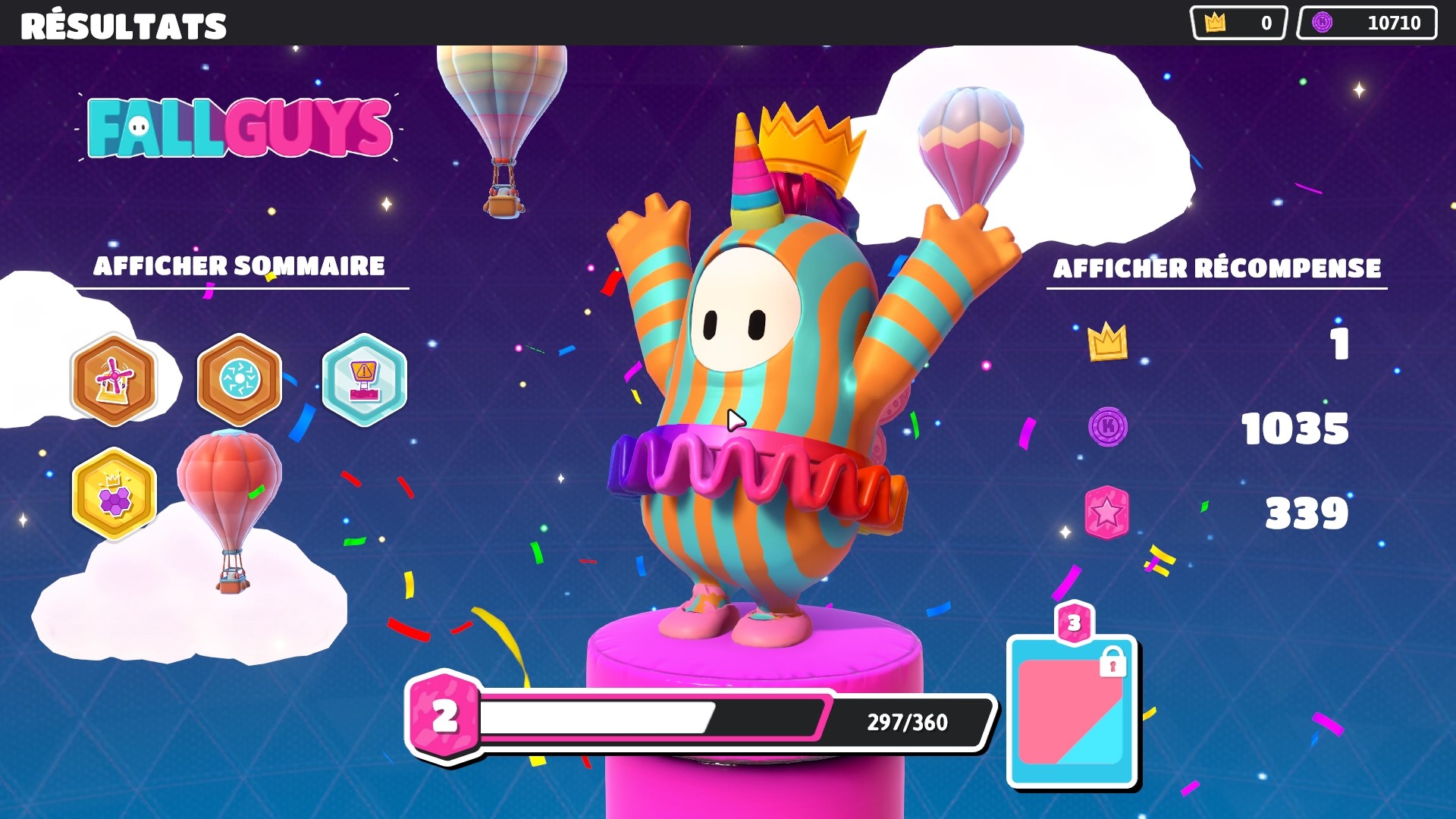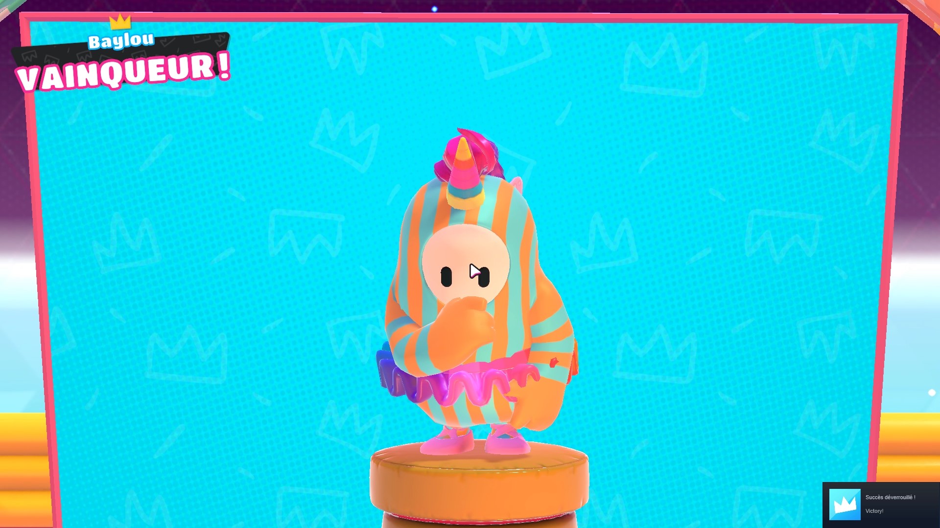 La victoire est la quête ultime des fallguyssiens grace à elle ils debloquent des skins doré pour montrer leur niveau auprès de leur amis et ils sont de toute façon de féroces compétiteurs